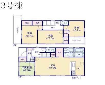 2階には洋室5.75帖、洋室6.5帖、洋室7.5帖と、トイレ、バルコニー2面があります。