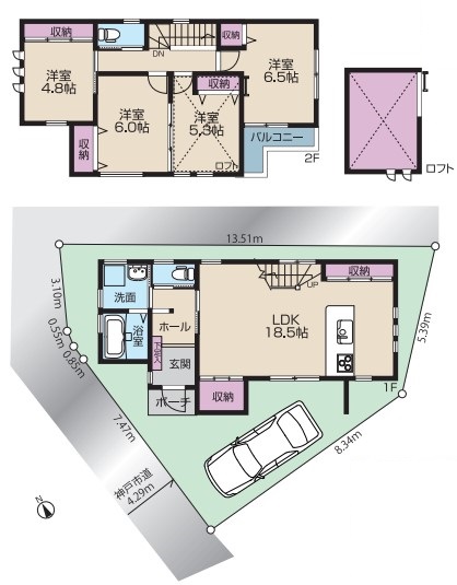 2階にはロフト付きの洋室5.3帖、洋室4.8帖、洋室6帖、洋室6.5帖と、トイレ、バルコニーがあります。