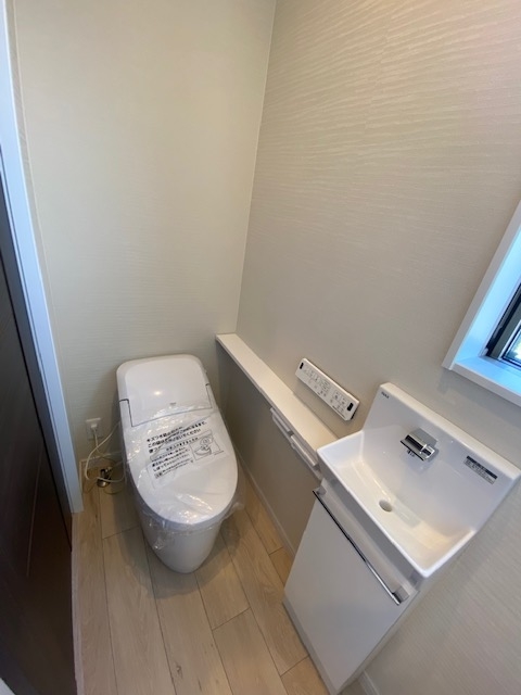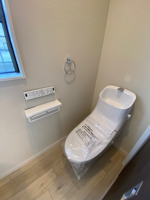 ホール奥にあるトイレです。温水洗浄便座と2連の紙巻き器が標準装備されています。