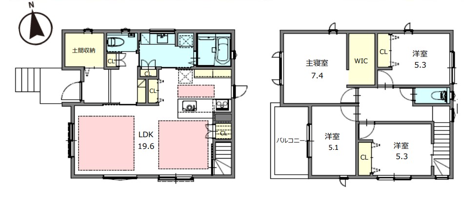 2階には洋室5.1帖、5.3帖、5.3帖、7.4帖と、トイレ、バルコニーがあります。