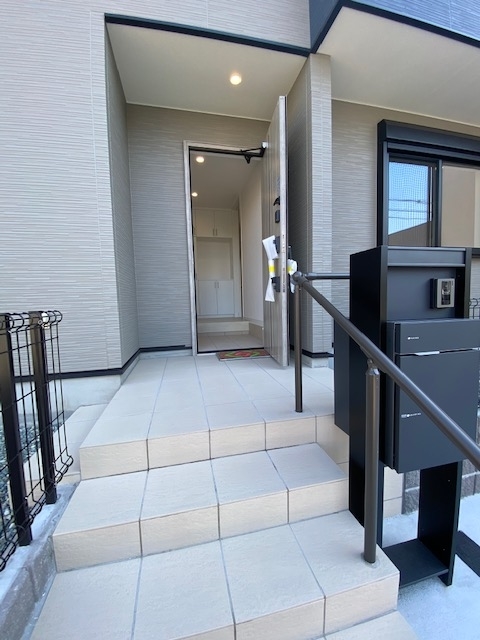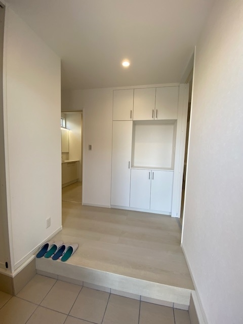 玄関左側には、土間収納が、正面には大型のシューズボックスが設置されています。