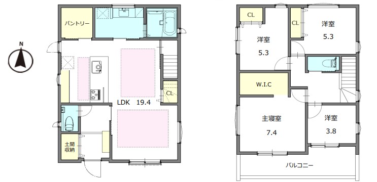 2階には3.8帖の洋室、5.3帖の洋室2部屋、WIC付きの7.4帖の洋室とトイレ、バルコニーがあります。
