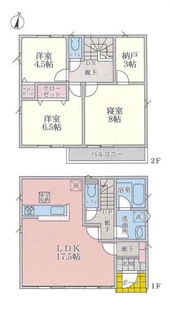 2階には、納戸3帖、4.5帖の洋室、6.5帖の洋室、8帖の洋室と、トイレ、バルコニーがあります。