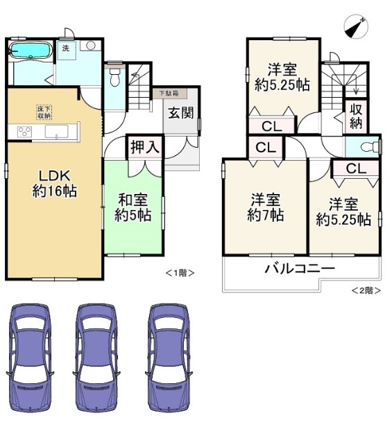 2階には洋室5.25帖、5.25帖、7帖と、トイレ、バルコニーがあります。