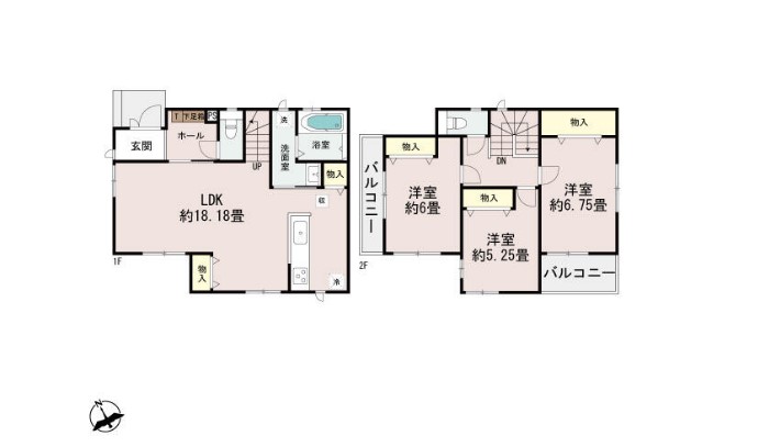 2階には5.25帖の洋室、6帖の洋室、6.75帖の洋室とトイレ、バルコニー2面があります。