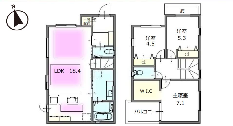 2階には5.3帖の洋室、4.5帖の洋室、WIC付きの7.1帖の洋室とトイレ、バルコニーがあります。