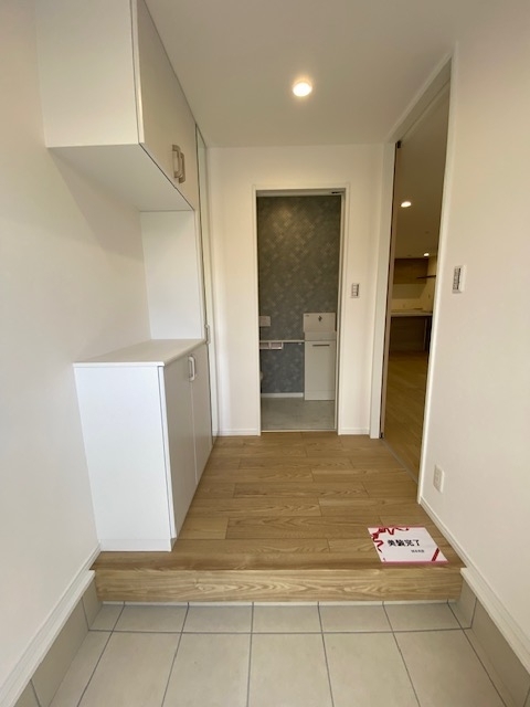 玄関左側には、シューズボックスが、右側には土間床収納が設置されています。
