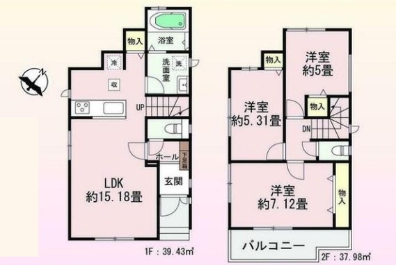 2階には洋室5.31帖、洋室5帖、洋室7.12帖と、トイレ、バルコニーがあります。