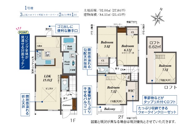 土地面積は92.04㎡(27.84坪)、建物面積は84.15㎡(25.45坪)です。