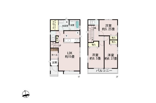 2階には5.25帖、6.37帖、6.5帖、の各洋室と、トイレ、バルコニーがあります。