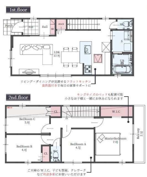 2階にはWIC付きの7帖、5帖、4.5帖、4.4帖の洋室、トイレ、バルコニーがあります。