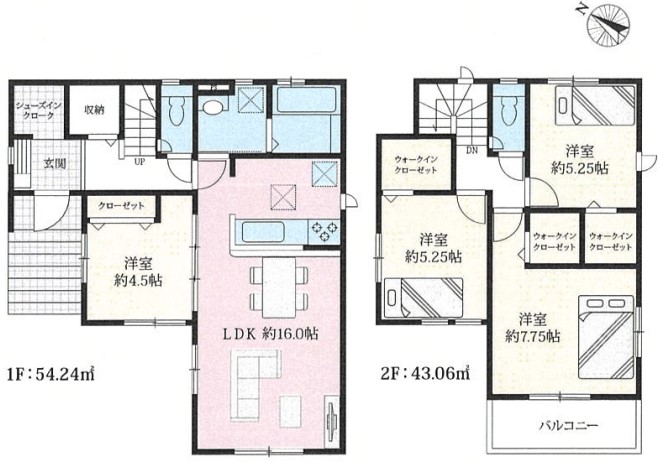 2階には5.25帖、5.25帖、7.75帖の洋室とトイレ、バルコニーがあります。
